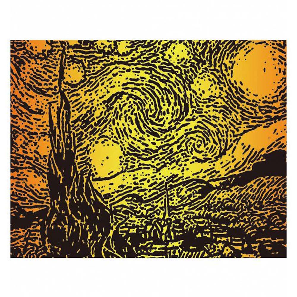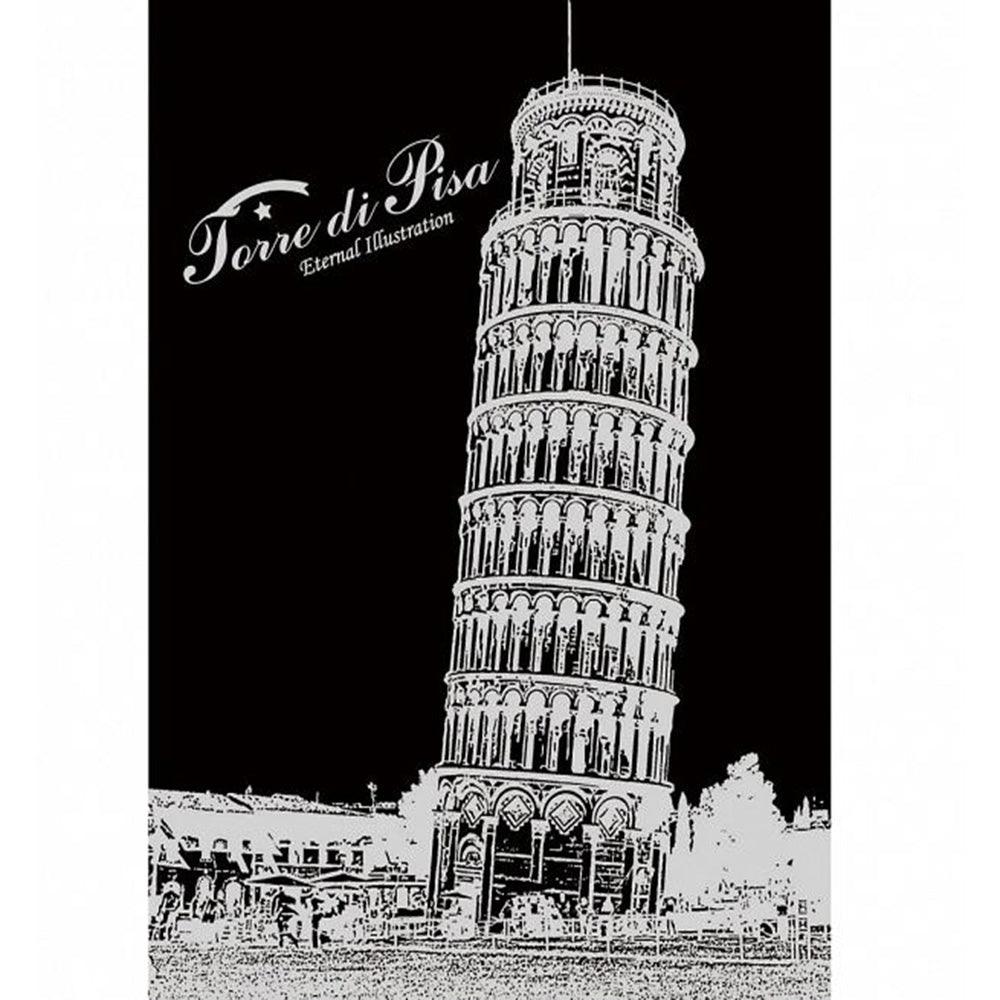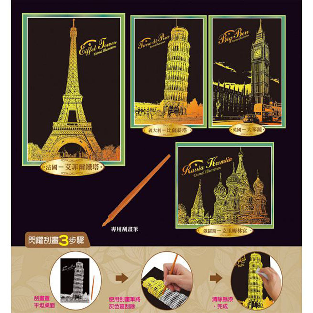 刮畫是一種運用創意、全新的創作素材,不需要藝術基礎,大人小孩皆可享受美好的視覺饗宴。更不須添購美術用具,只要利用附贈的刮畫筆將原本墨黑的紙張上的黑漆輕輕刮去,就能顯示出刮畫紙卡內藏的閃耀光芒,特殊的畫面設計,讓使用者在刮除灰色線條後,就能顯現出璀璨的畫面,它可以是畫像中的亮點,也可以是呈現明暗的技法,製作刮畫的過程中充滿驚喜趣味;超值包裝,包含四大世界知名建築物--羅斯克里姆林宮、英國大笨鐘、巴黎鐵塔、比薩斜塔以及四幅世界名畫--梵谷的星空、達文西蒙娜麗莎的微笑、畢卡索的夢、阿爾及爾的女人。