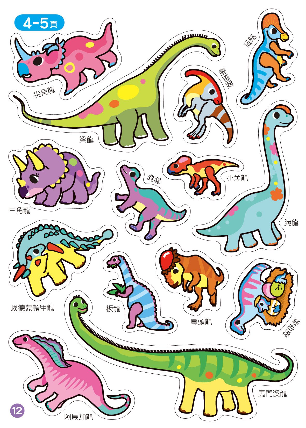 貼紙旁邊標示恐龍名稱,幫助孩子認識各式各樣的恐龍。