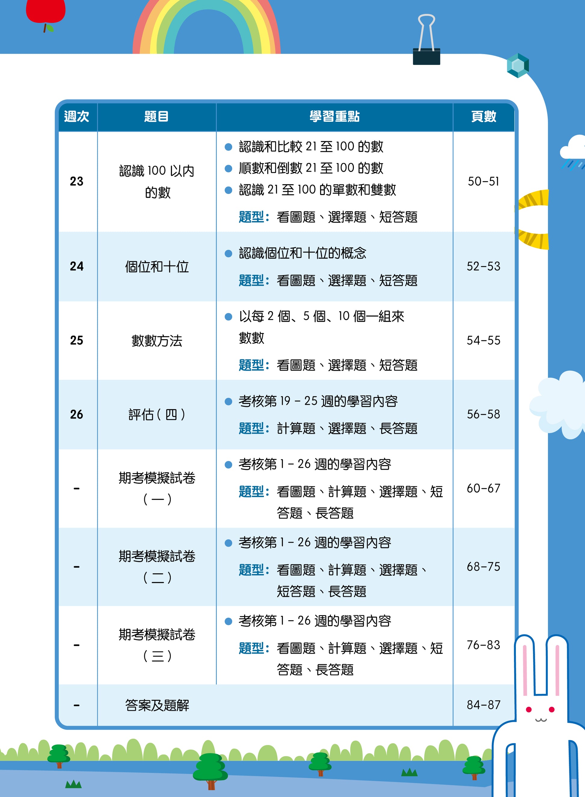 練習數量:每冊26個練習、4 次評估及3 份期考模擬試卷