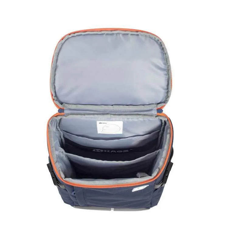 DUSTIN 系列書包為了方便小朋友上課使用,採取了一個時尚嶄新的頂部翻蓋設計。小朋友只需要拉一條拉鏈便能輕易取得書包內的所有書本及習作。另外,更為小朋友作了一個獨一無二設計,於頂部翻蓋的部份作了一個保溫便當內格,帶飯的小朋友從此不用再另攜便當袋。像其他的KAGS書包一樣,此系列一樣有為小朋友而設的護脊設計和為提高舒適感而加厚的肩帶。書包表面的反光物料也可令小朋友在夜間出入變的更安全。